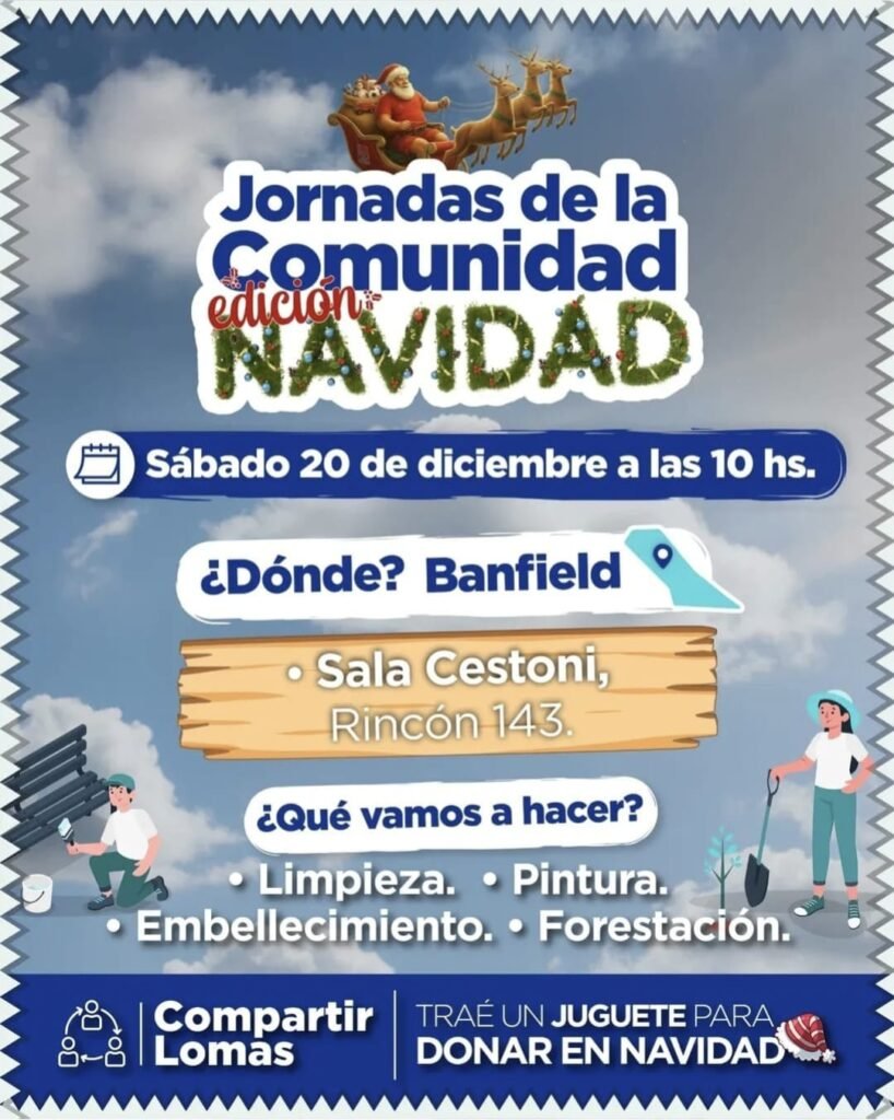 Este sábado 20 de diciembre, desde las 10 horas, Banfield volverá a ser escenario de una jornada solidaria y participativa con una nueva edición de las Jornadas de la Comunidad – Especial Navidad. La iniciativa convoca a vecinas y vecinos a sumarse a una mañana de trabajo colectivo, con el objetivo de mejorar y embellecer los espacios comunes del barrio.
